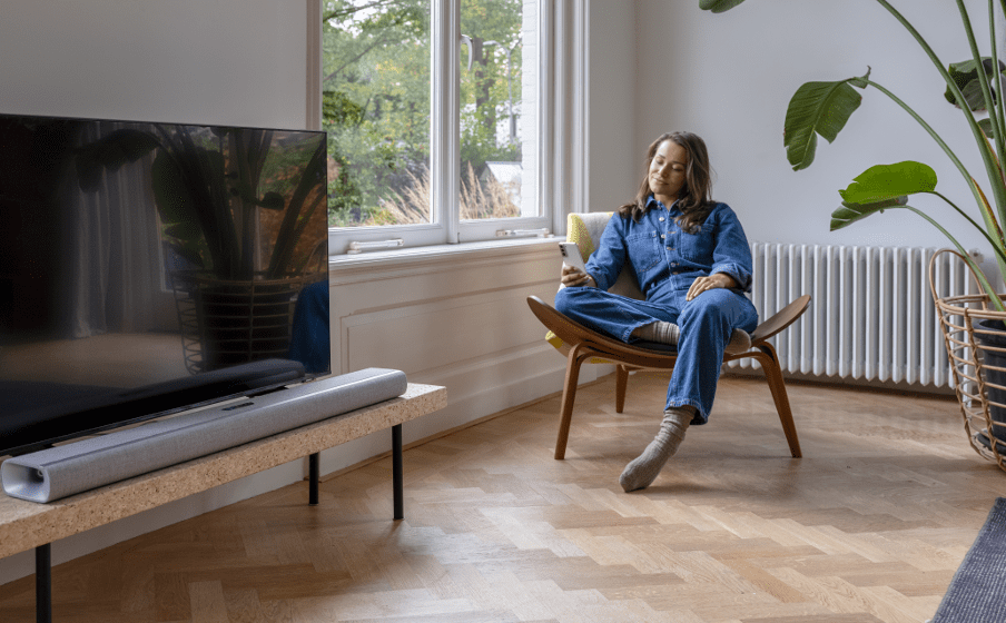 دو درایور ارتفاعیِ روبهبالا افکتهای بالاسری را بازتولید میکنند تا صدایی فراگیر و چندلایه شکل بگیرد؛ فناوری MultiBeam™ نیز امواج صدا را در فضا پخش میکند تا بدون اسپیکرهای جانبی، حس احاطهشدن در صحنه ایجاد شود. نتیجه، صدایی سینمایی و وسیع از یک بدنهٔ باریک و شیک است.